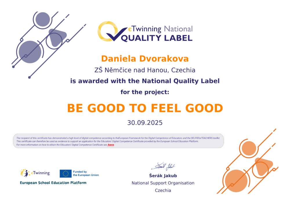 - Škola získala National Quality Label a Pupil Quality Label za eTwinningový projekt Be Good to Feel Good!