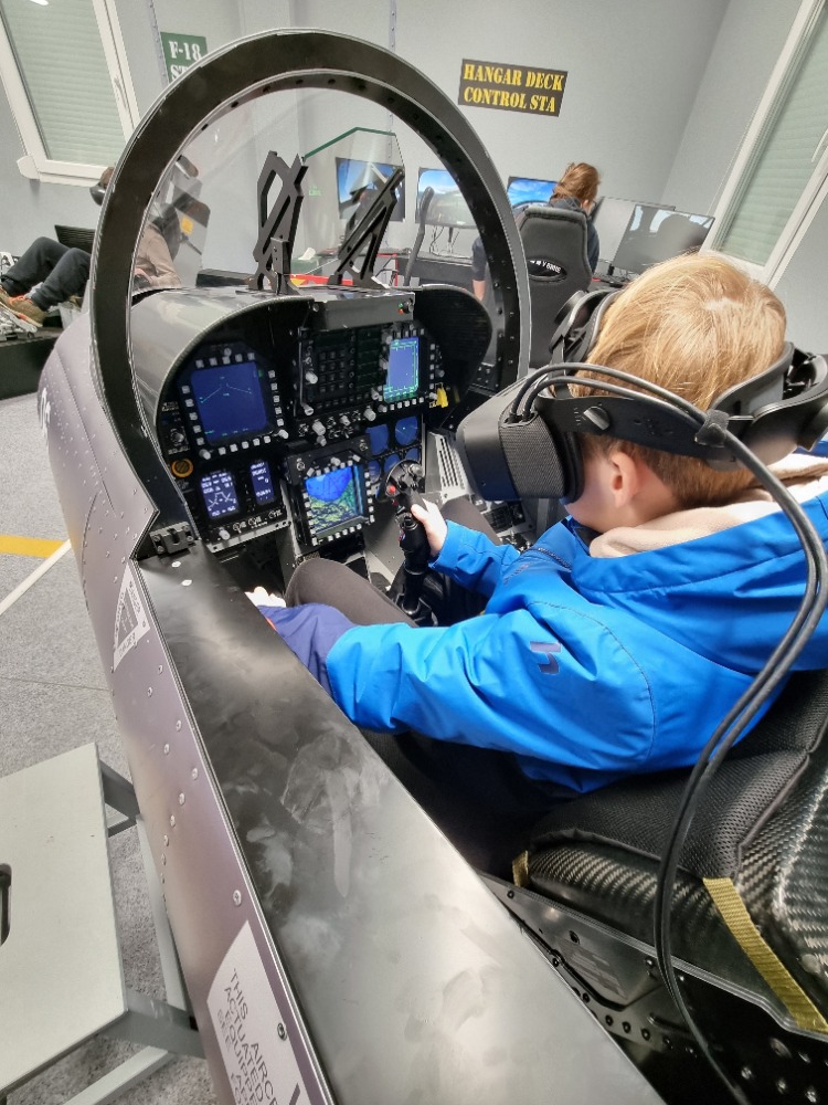Poté jsme se přesunuli do Technického muzea, kde nás čekal program o historii letectví. Dozvěděli jsme se, jak se lidé od prvních pokusů s létáním dostali až k moderním letadlům, a objevili jsme i fyzikální principy, díky kterým se obrovské stroje udrží ve vzduchu. A teď to nejlepší: žáci si mohli vyzkoušet pilotování letadla! Díky virtuální realitě a simulátoru v části skutečného kokpitu si spousta z nás na chvíli připadala jako opravdový pilot či pilotka.