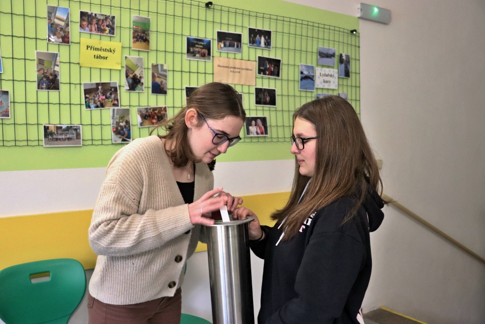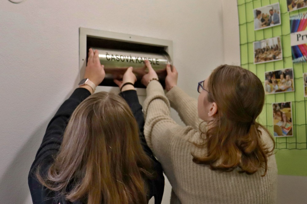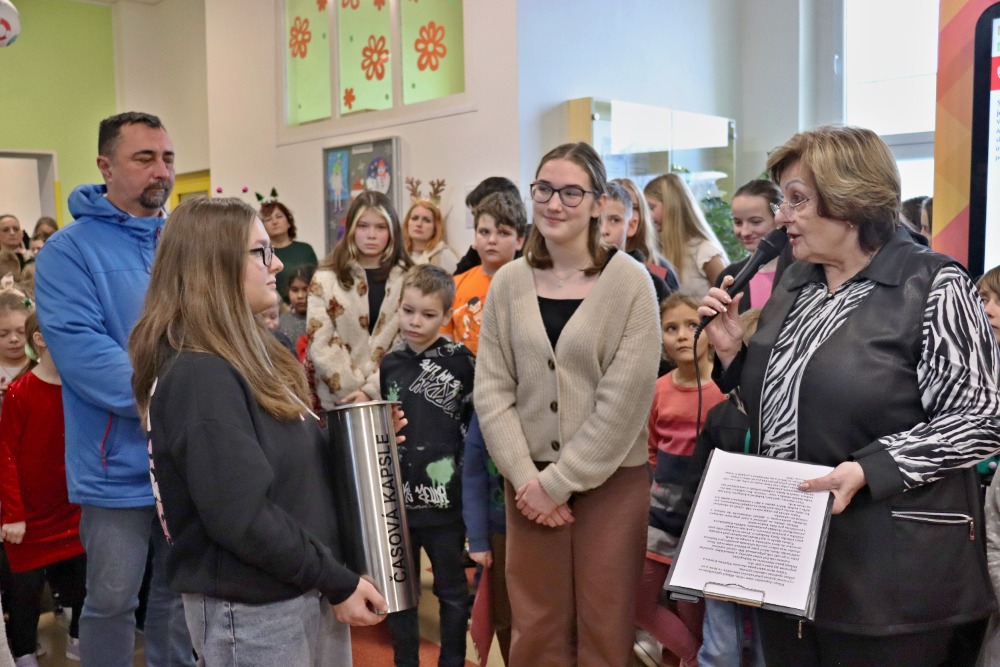 Vánoční čas je již za námi, ale tradiční setkání u školního stromečku, kdy si společně všichni žáci i pedagogové zazpívají vybrané koledy a každý rok do svého repertoáru přidají i novou cizojazyčnou (anglickou, španělskou či německou) je vždy okamžikem, který doznívá a na který se vzpomíná ještě hodně dlouho poté. Letošní „koledování“, které svou návštěvou poctil i starosta města Martin Ernst, však nebude zapomenuto nikdy. Při této příležitosti byla do zdi naší školy uložena časová kapsle s poselstvím pro budoucí generace a tímto symbolickým aktem byly slavnostně ukončeny oslavy 100. výročí naší školy.