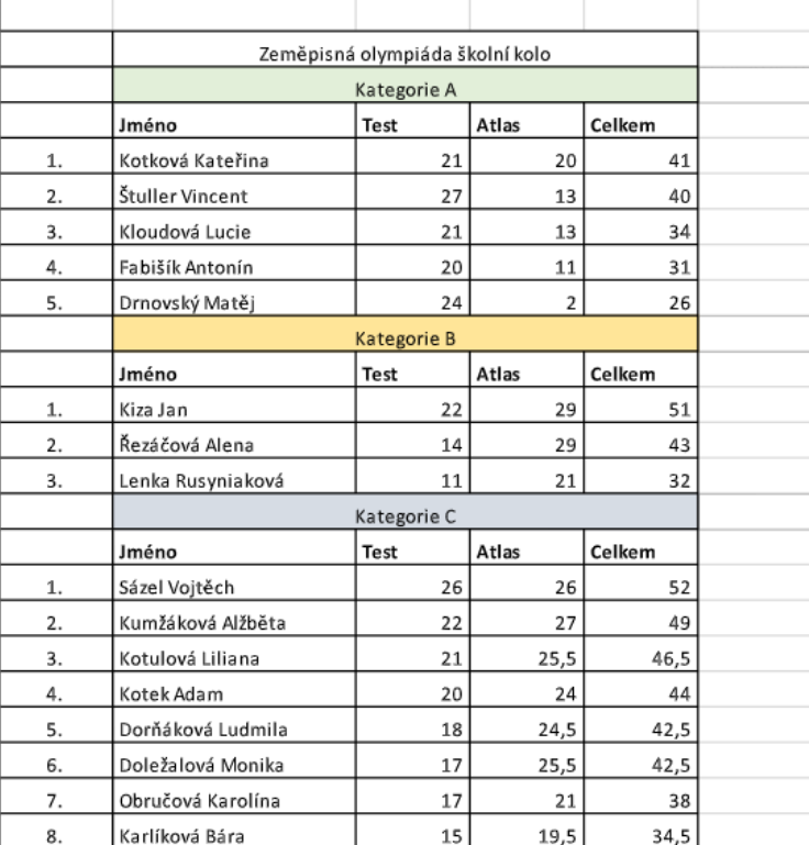 Nakonec se školního kola zúčastnilo „jen“ 16 žáků ve třech kategoriích. Kromě online testu pracovali ještě s atlasem a na základě bodového zisku v obou částech bylo stanoveno výsledné pořadí. První dva z každé kategorie postupují do okresního kola, které se bude konat ve středu 18. února v Prostějově.