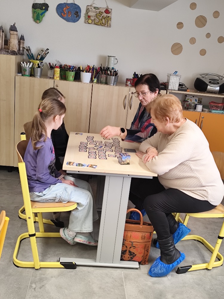 Starší děti se zúčastnily setkání se seniory, kde si společně zahrály deskové hry, například Člověče, nezlob se nebo šachy. Společné hraní přineslo nejen zábavu, ale i prostor pro rozhovory a sdílení zkušeností. Bylo hezké sledovat, jak se mezi generacemi přirozeně vytváří přátelská atmosféra.